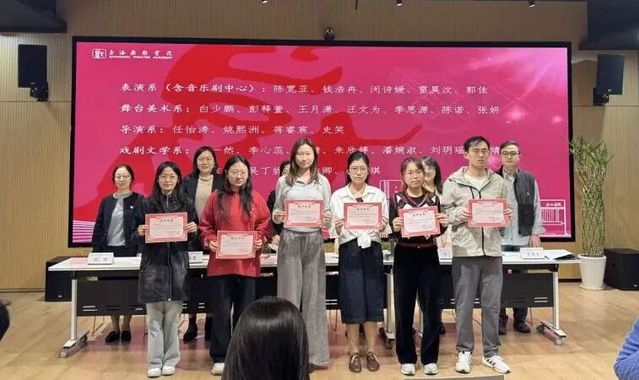 随后,曹颖老师宣读了本次积极分子培训班的结业学员名单。在热烈的掌声中,各位领导老师为学员颁发结业证书,并合影留念。接着,四院系优秀学员代表依次上台分享了培训体会。表演系(含音乐剧中心)陈宽亚同学表示其通过党课培训深化了对党的认识,明确了艺术工作者的责任,未来将自觉把艺术追求与党的宗旨相结合,用表演弘扬真善美、传播正能量,在专业精进与品德修养中践行党员标准,为社会主义文艺事业贡献青春力量。